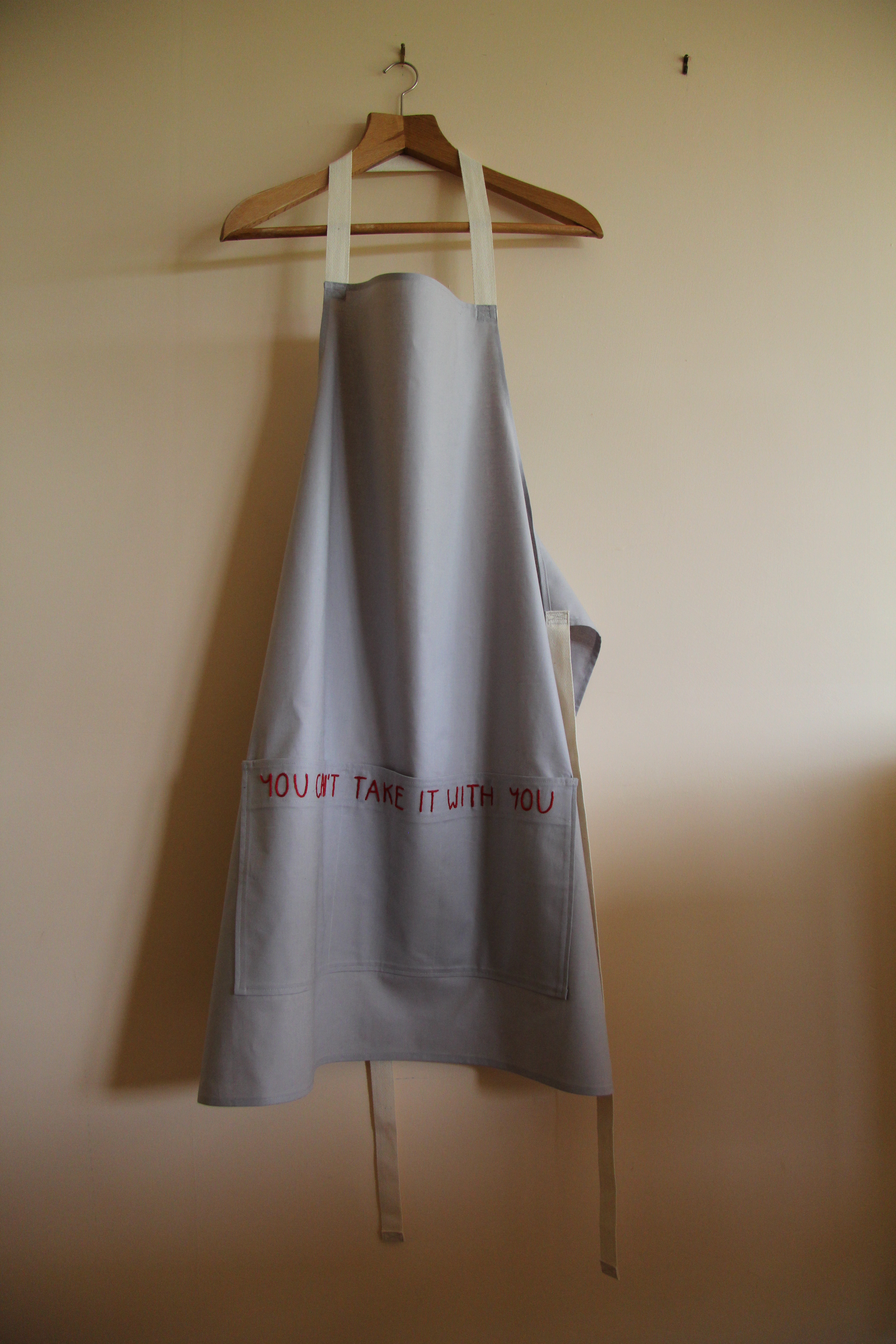 Cheryl chose “you can’t take it with you.” Initially I was going to find another floral fabric do something similar to the first apron but over the summer I was sat in the Prado gallery watching a French film about the Spanish Civil War with Spanish subtitles. After a while the words just washed over me as I watched these poetically shot images of war, my back to The Guernica which incidentally is one of the most amazing pieces of artwork I have ever seen in the flesh. Cheryl’s home truth took on a new significance for me as the film brought home the impermanence of everything.