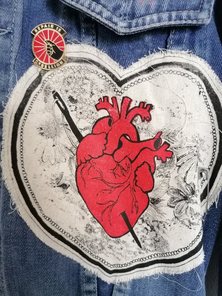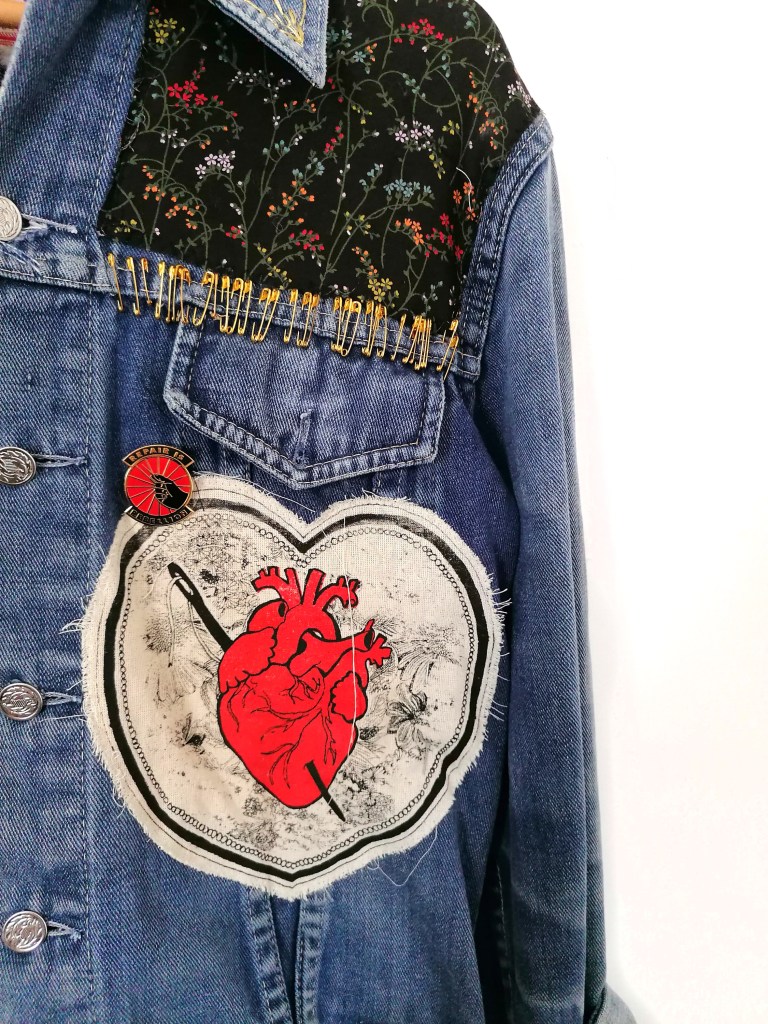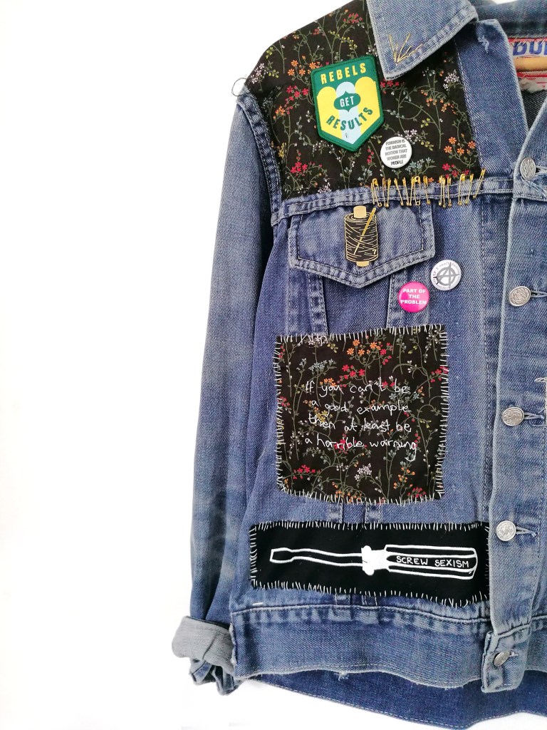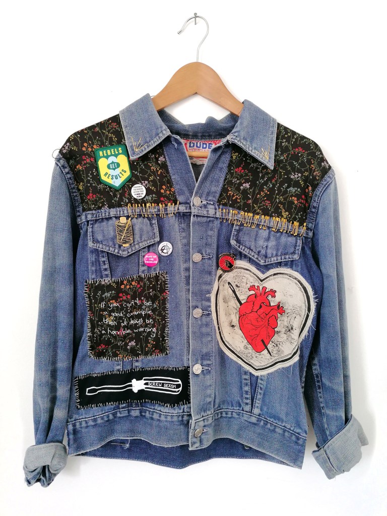 I love making battle jackets. I like how you can be methodical and creative but also DIY, how you can make something that looks like it was thrown together but which actually took time to craft. Again, this is a piece that questions the idea of value when it comes to art making and how printing onto fabric as opposed to paper devalues the item. The battle jacket is an act of rebellion in itself so they also naturally subvert ideas of production